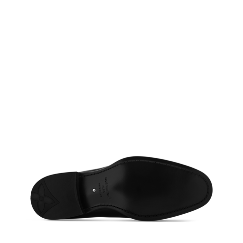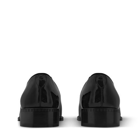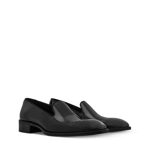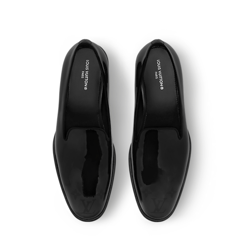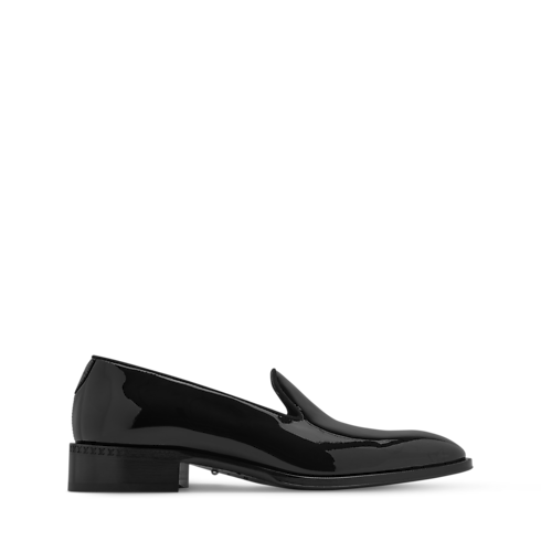 The LV Premiere slipper is crafted from glossy patent calf leather, complementing its sleek, elegant lines. This model, which features a slightly higher than usual heel, reinterprets the refined silhouette of English gentlemen. The toe is signed with a gradient Monogram pattern, while the leather outsole bears a decorative pearl, a signature of Men's Creative Director Pharrell Williams.