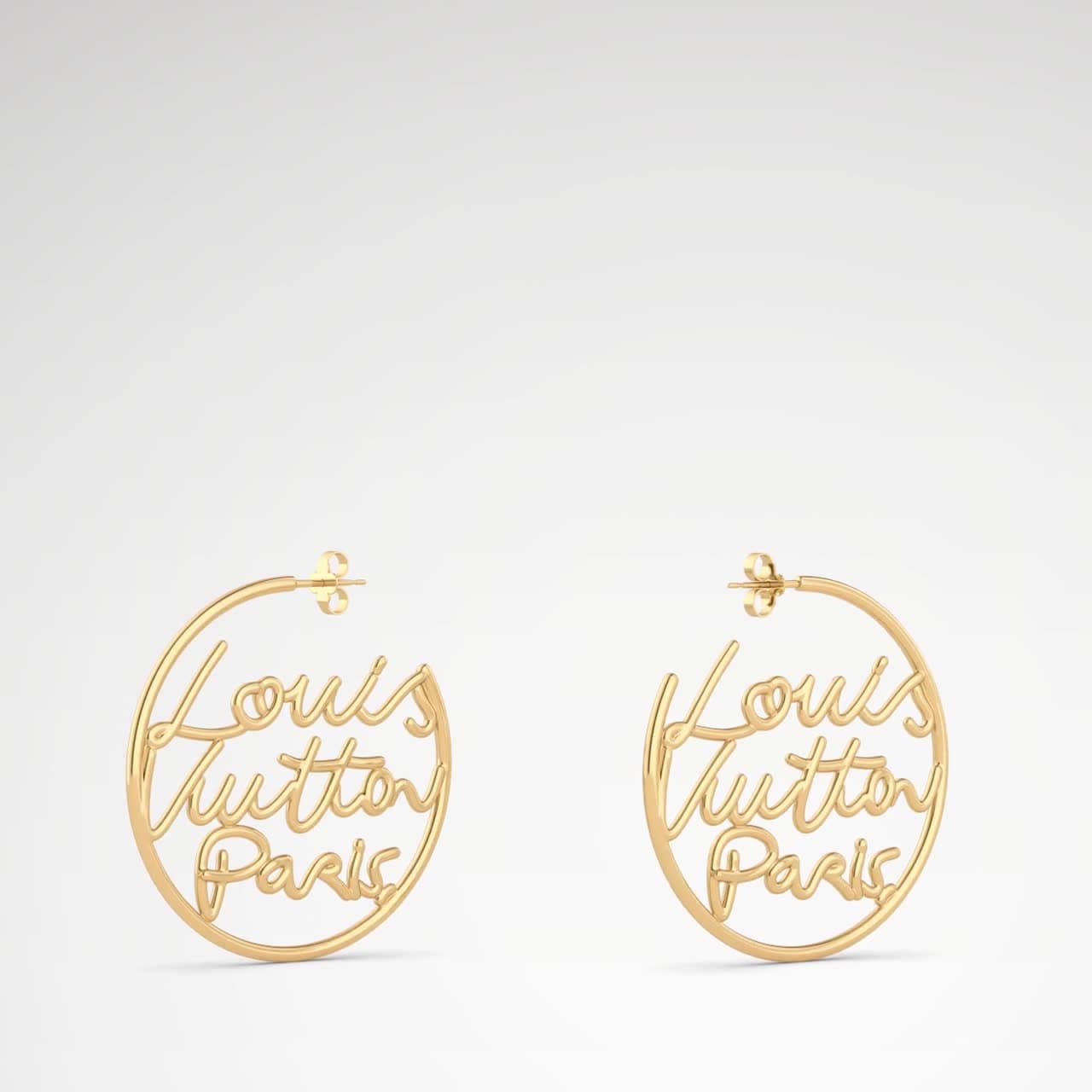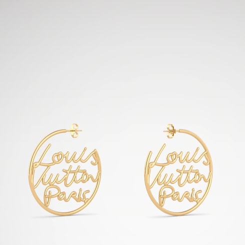 The stylish and sophisticated LV Script earrings feature a distinctive House hallmark spotlighted in the Spring-Summer 2025 runway show. Their unique design combines slim gold-colored metal hoops with a Louis Vuitton Paris signature crafted in an elegant, fluid hand-written style. Lightweight and easy to wear, these on-trend earrings are perfect for all occasions.