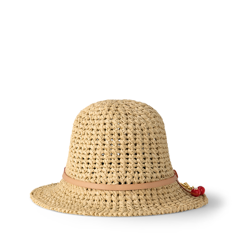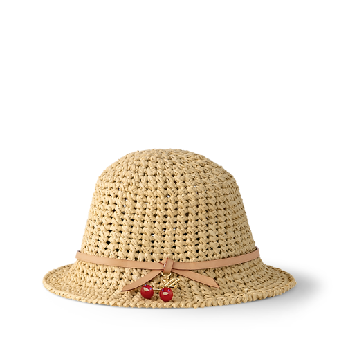 As light and breezy as a summer day, the LV x TM Cerise Charms hat combines a classic House signature with an eye-catching artistic touch. Styled in raffia, it features a cowhide strap adorned with an LV Initials charm and two bright, cheerful cherries – a key theme in the re-edition of the Louis Vuitton x Murakami collection. A stylish, practical hat, perfect for keeping cool and comfortable under the sun.