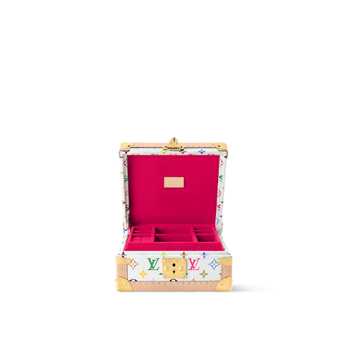 Part of the re-edition of the Louis Vuitton x Takashi Murakami collection, the Coffret Joaillerie is crafted from vibrant Monogram Multicolore canvas. Natural cowhide-leather trim, a golden-brass S-lock, and reinforced corners highlight its classic lines. Lined in a fuchsia microfiber, the interior features compartments for rings, bracelets, necklaces, and earrings.
