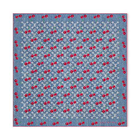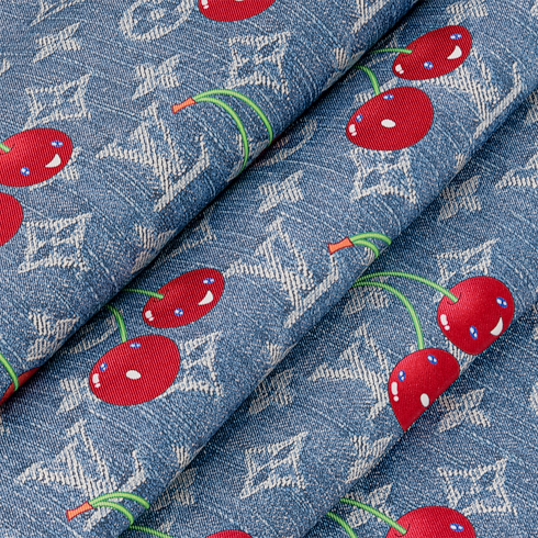 Created for the re-edition of the exceptional Louis Vuitton x Murakami collection, the all-silk LV x TM Denim Cerise square updates a historic House signature in the celebrated Japanese artist’s bold, playful style. Its striking design combines a denim-look Monogram background with a vibrant pattern of bright, cheerful cherries. A Louis Vuitton signature in a matching shade adds an extra pop of color to this fun, versatile accessory.