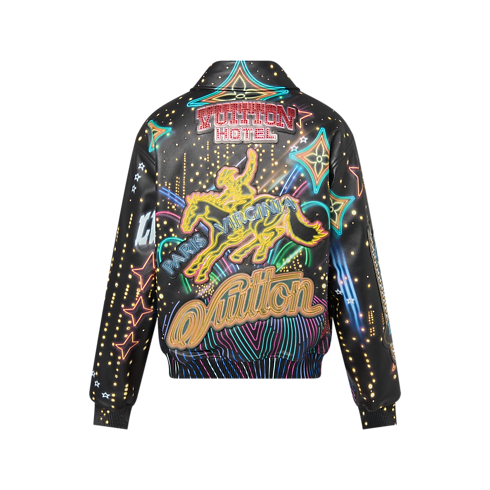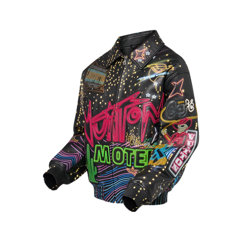 This richly ornamented leather blouson from the FW24 Show runway is adorned with a digitally printed Vuitton Motel motif inspired by the neon-lit cities of the American West. The print is amplified with crystals and embossed leather patches featuring playfully reimagined House signatures. This Made to Order piece embodies the House’s creative savoir-faire.