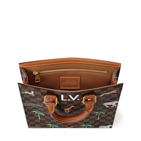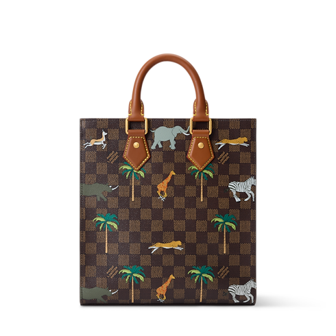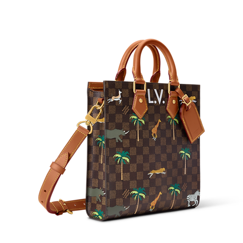 The Mini Sac Plat in Damier Heritage canvas, accented with brown leather trim, showcases a dynamic print of wild animals stampeding across its surface. Bold white L.V. initials crown the design, a nod to the film. Inside, a brown cotton lining and zipped pocket offer practicality, while a detachable, adjustable strap adds carry options.