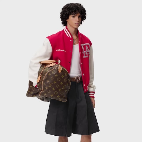 American tradition meets Louis Vuitton savoir-faire in this vibrant red varsity blouson inspired by Pharrell Williams’ past as a member of the drumline at Princess Anne High School in Virginia. This iconic piece from the SS24 Show features an embossed tonal Damier on the white calfskin sleeves, a pearl-embroidered Louis Vuitton logo on the back and a crystal-embroidered PA patch on the chest that renders homage to Williams’ story.