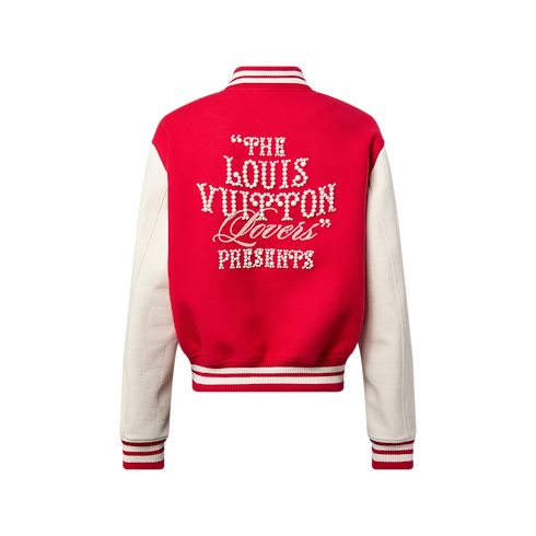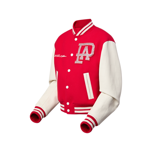 American tradition meets Louis Vuitton savoir-faire in this vibrant red varsity blouson inspired by Pharrell Williams’ past as a member of the drumline at Princess Anne High School in Virginia. This iconic piece from the SS24 Show features an embossed tonal Damier on the white calfskin sleeves, a pearl-embroidered Louis Vuitton logo on the back and a crystal-embroidered PA patch on the chest that renders homage to Williams’ story.