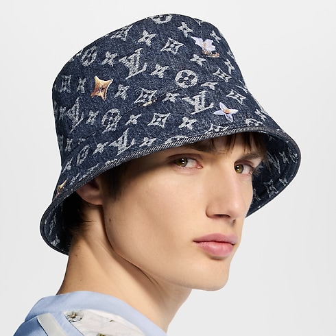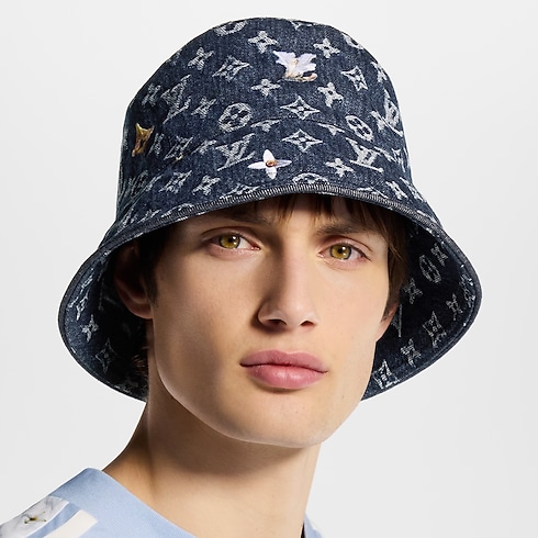 The Monogram Flower denim bucket hat is a contemporary silhouette with refined embellishments. The 100% cotton style is crafted from a timeless denim wash adorned with a Monogram pattern. A handful of flowers is embroidered in white and yellow, balancing the masculine silhouette with a sweet softness.