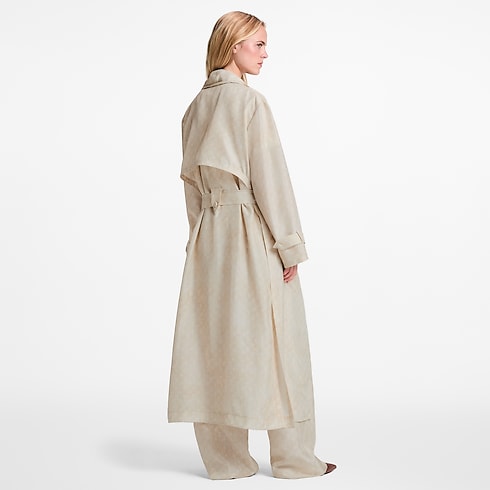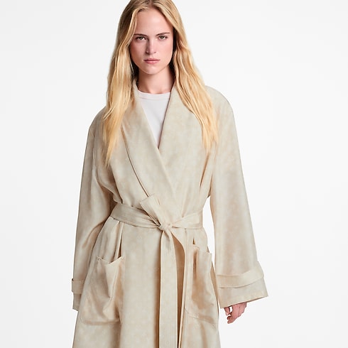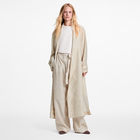 This light coat is breezy and elegant for versatile styling in lightweight silk in an allover Monogram print in a soft seasonal shade. The fluid, full-length silhouette is cut with a smart notched collar and finished with two practical patch pockets on the side, while a slim D-ring belt adds definition to the waistline.