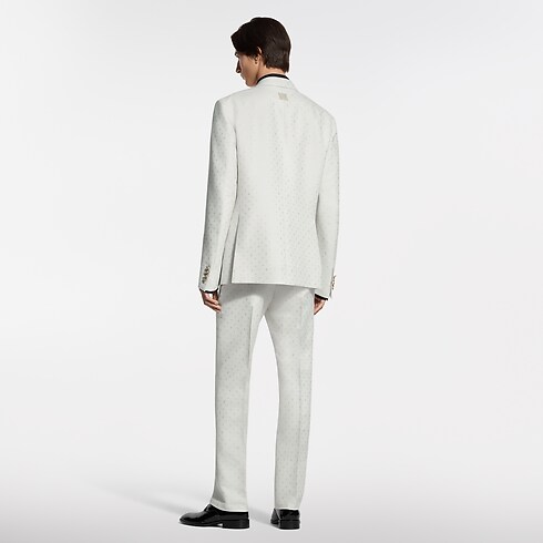 These tailored evening pants stand out from the crowd in a pale ivory hue for summery celebrations. Crafted in a luxurious blend of silk and mohair, they are adorned with a tone-on-tone jacquard Spaced Mini Monogram motif, which is expressed in a subtle play of matte and lustrous textures. A matching double-breasted jacket makes a sharp suit.