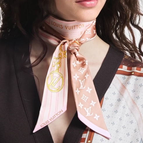 Inspired by the iconic Neverfull handbag, the all-silk My Neverfull BB bandeau is an ode to the House’s luggage-making legacy. Its bold, graphic pattern recalls the striped canvas linings of Neverfull handbag, accented by an illustration of the historic “Articles de Voyage” patch. LV Circle and Monogram Flower emblems add an extra signature touch.