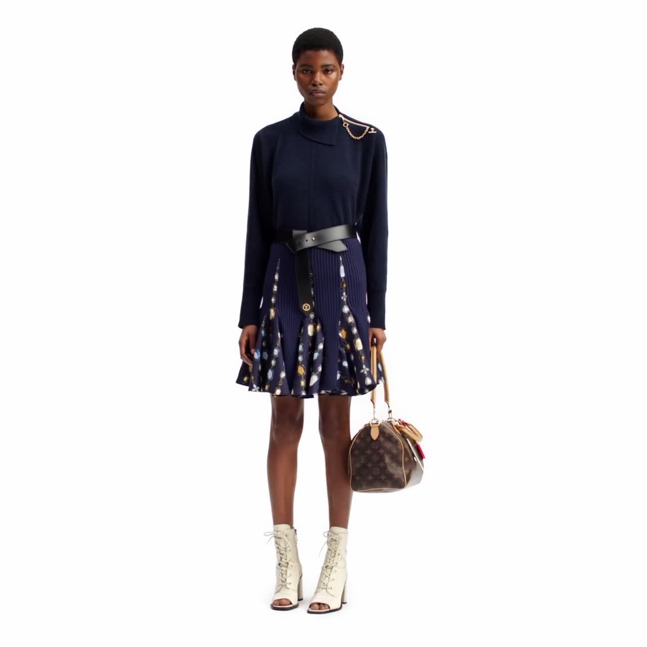 This skirt makes a playful seasonal statement. It is knitted in a clean, figure-skimming silhouette from ribbed cotton blend in a refined seasonal shade, while satin godet inserts introduce spirited volume and color in the collection’s striking necklace print, which twists Louis Vuitton charms with richly hued precious gemstones.