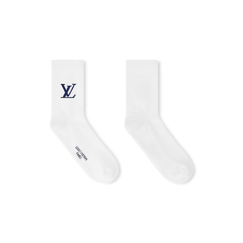 The Italian-made Only LV socks bring a simplistic elegance to the sporty staple. The LV Initials in deep blue are knit on the white cotton-blend pair above the ankle, and LOUIS VUITTON PARIS on the bottom of the foot is a surprise embellishment for the wearer's delight.