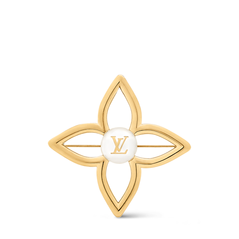 Inspired by the classic Monogram motifs and the timeless beauty of the pearl, the Pearly Flower brooch emanates feminine refinement. Its understated design features an openwork Monogram Flower in radiant gold-toned metal encircling a white resin pearl accented with the LV Initials. An exquisite jewel, and a sophisticated expression of the House’s signature style.