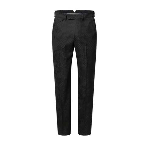 These chic black evening pants are crafted from a luxurious wool jacquard featuring a tone-on-tone Monogram Wildflowers motif with a sumptuous textured finish. Tailored with an elegant Pont Neuf fit, they are signed with an LV-embroidered triangular tab on the right hip and a Marque L.Vuitton Déposée label on the rear waistband. A matching jacket makes a sophisticated suit.