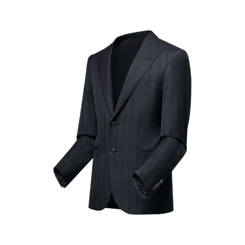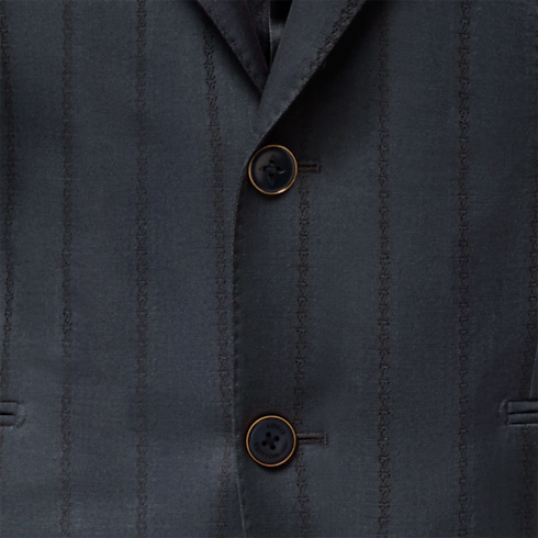 This sleek single-breasted Pont Neuf jacket plays with the codes of tailoring by reinventing the classic pinstripe motif, which is reconfigured here as a string of miniature LV signatures integrated into an LV Stripes jacquard. Crafted from fine wool in an elegant navy blue, this flattering piece makes a chic formal suit paired with matching cigarette pants.