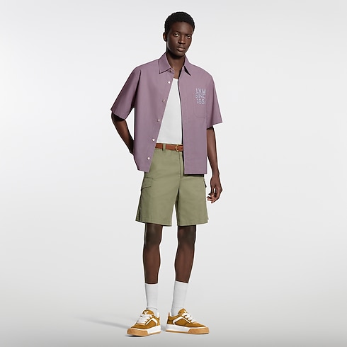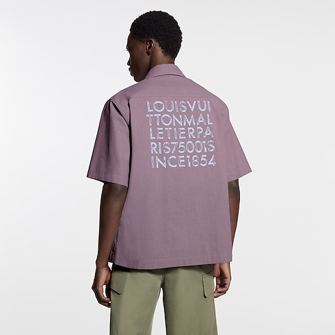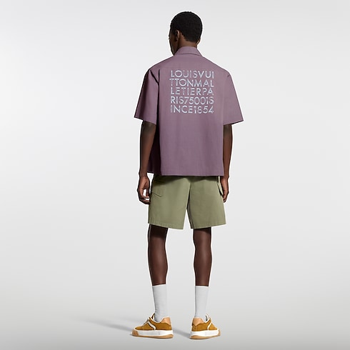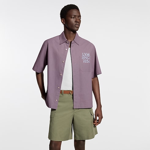 This crisp, short-sleeved lilac shirt complements this season’s subtle colors. Hand-painted effect printed signatures from the Spring-Summer 2026 show lend graphic accents, with L.V.M. Legacy lettering over the breast pocket and an LV Alphabet motif across the back. Mother-of-pearl effect buttons add a lustrous finishing touch.