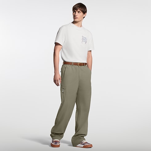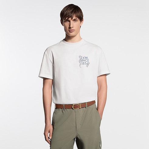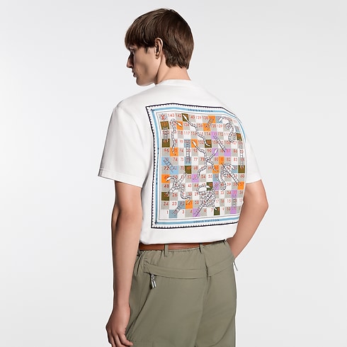 This white cotton T-shirt is adorned with the playful Snakes and Ladders motif from the Spring-Summer 2026 show runway. The new L.V.M. signature is printed on the chest, framed by a Monogram-adorned snake and a ladder, while on the back, the board game is represented on a Damier checkerboard replete with House signatures.