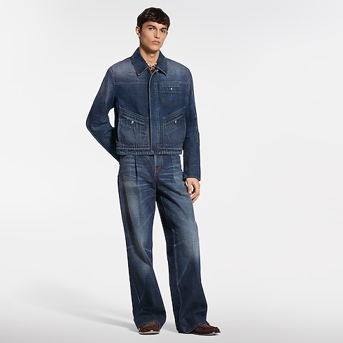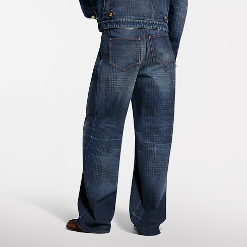 These wide-leg pants from the Spring-Summer 2026 show playfully twist sartorial codes, with a glen check, inspired by heritage tweeds, printed onto the indigo denim. The organic cotton fabric has a washed vintage finish, while the pleated front creates an elegant silhouette. Leather signature details accent the ticket pocket and belt. A matching blouson makes a total look.