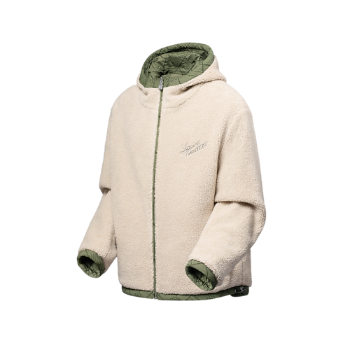 This wintery interpretation of the windbreaker has a contemporary reversible design. The technical fabric on the outside is adorned with a graphic green Damier Argyle diamond plaid incorporating Marque L.Vuitton Déposée signatures. Inside out, it becomes a cosy cream-colored fleece with a delicately embroidered cursive Louis Vuitton signature on the chest. Perfect for the midseason, this versatile design can be worn on cold or rainy days.