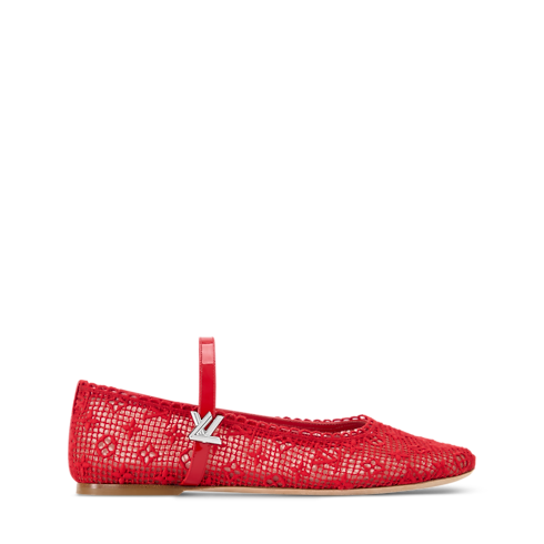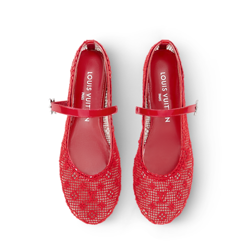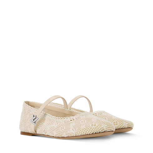 - The Romy flat ballerina is interpreted in fabric embroidered with the Monogram pattern, resulting in a pretty, lace-like effect. Scalloped edging and a patent leather strap with an LV Twist accessory complement this feminine, round-toe ballet pump, which is finished with a supple leather outsole.