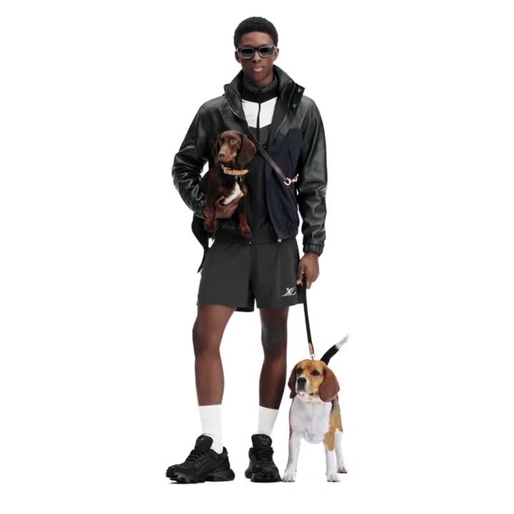 This black tracksuit top combines fashion and functionality. The soft and breathable technical fabric provides warmth and insulation with 4-way stretch for ease of movement. Sporty gray and white inserts create a flattering color-blocked look, embellished with reflective Vuitton lettering on the chest. A matching T-shirt and shorts make a coordinated set.