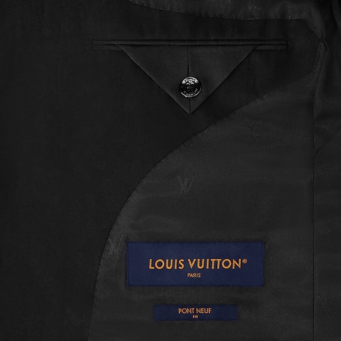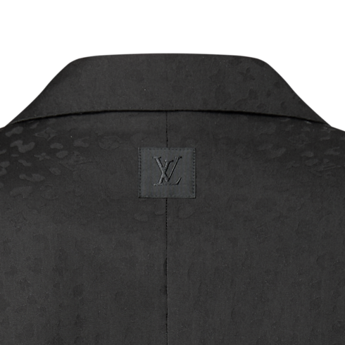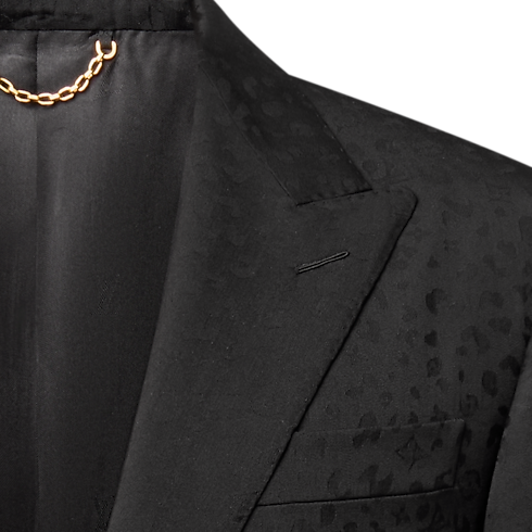 This sleek, black, single-breasted evening jacket is richly embellished with this collection’s LV Cheetah motif. Interpreted as a rich satin jacquard made from responsibly-sourced wool, the graphic feline pattern integrates discreet Monogram signatures in a rich interplay of matte and lustrous textures. Matching cigarette pants make a sharp silhouette that stands out from the crowd.