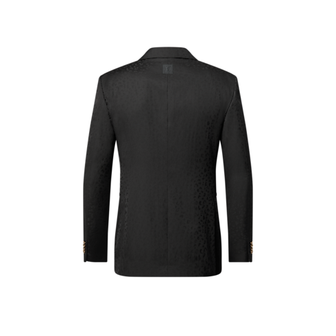 This sleek, black, single-breasted evening jacket is richly embellished with this collection’s LV Cheetah motif. Interpreted as a rich satin jacquard made from responsibly-sourced wool, the graphic feline pattern integrates discreet Monogram signatures in a rich interplay of matte and lustrous textures. Matching cigarette pants make a sharp silhouette that stands out from the crowd.