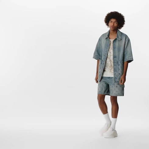 This versatile short-sleeved workwear shirt in washed denim can also be worn as a summery outer layer. The pared-down silhouette is distinguished with generous oversized pockets featuring an embossed allover Monogram motif. This essential summer piece has matching shorts for an effortless and trendy look.
