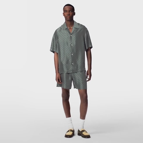 This open collar shirt in a fluid silk blend has an easy relaxed fit. Inspired by this collection’s nautical world, it is crafted from an LV Fishnet jacquard, with pale green LV signatures on an elegant grey background creating an iridescent graphic effect. This refined piece has matching shorts for a sophisticated day-to-evening look.
