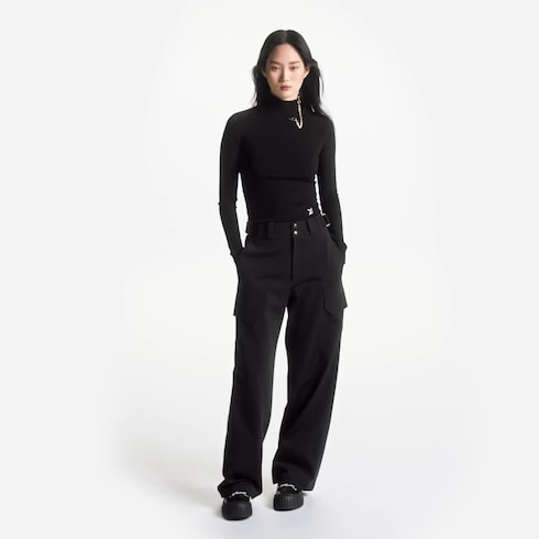 A wardrobe staple with a statement twist, this turtleneck sweater is elevated with an asymmetric exposed golden zip pulled with a coordinating chain that drapes elegantly around the collar. Crafted from a silky stretch knit in a comfortable second-skin fit, the contrast LV Initials sign the clothing look.