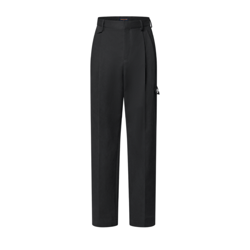 These cotton chino pants have a casual yet elegant silhouette with a pleated front, with flap and patch pockets adding a workwear twist. Applied signatures add a preppy accent, with an elegant embroidered Louis Vuitton in a cursive script on the left leg, while a rhinestone-embellished LV patch signs the back. The black color makes this a versatile piece for completing everyday looks.