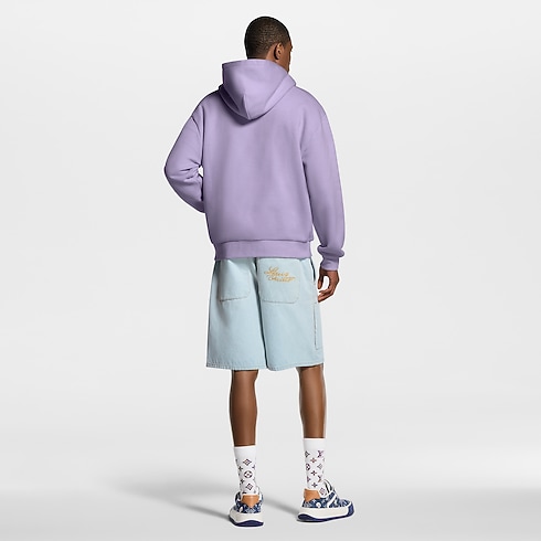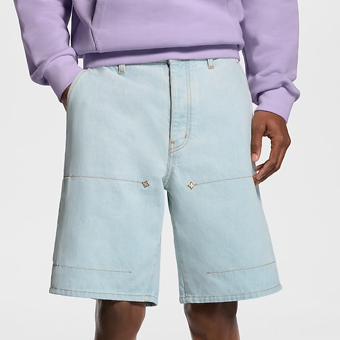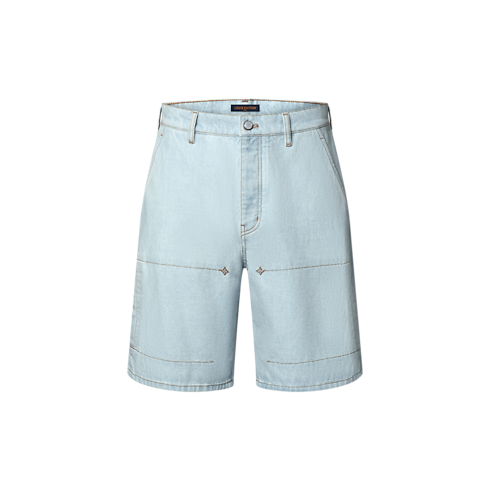Crafted from organic denim in a pale washed indigo, these summery workwear shorts embody this collection’s casual elegance. They are elevated with gold-toned cursive Louis Vuitton embroidery on a rear pocket, while Monogram Flower rivets adorn the front. Finishing touches include tobacco-toned topstitching and a chic pearly button fastening. A matching blouson makes a seasonal set.