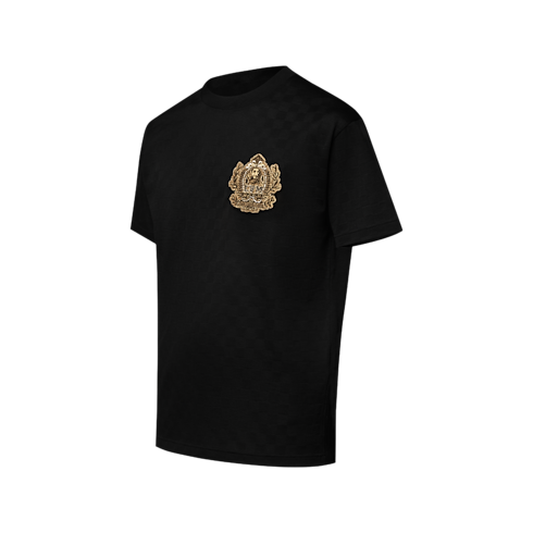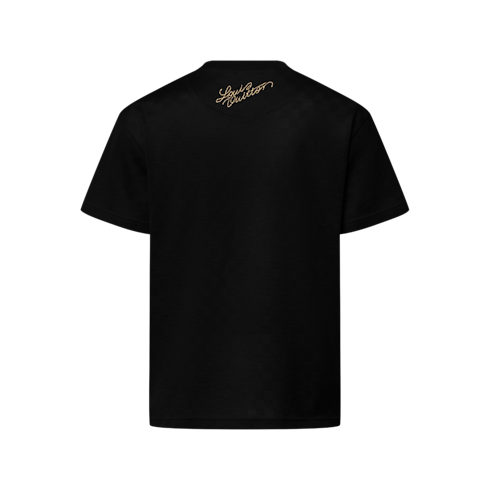 This collection’s Westminster dog walkers inspire this playfully regal chic black t-shirt. Crafted in organic cotton piqué with a textured Damier jacquard, it is adorned with embroidered golden signatures, including an ornate LV Dog coat of arms on the chest. Perfect for end-of-year festivities, this piece brings a sophisticated accent to a casual silhouette.