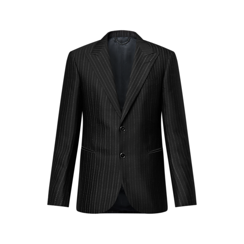 This timeless black single-breasted jacket has a sleek Pont Neuf silhouette. It is adorned with a flattering jacquard Pinstripe Micro Flower motif, featuring chains of Monogram Flowers, and has a subtle luster, thanks to the presence of silk fiber in the yarn. Matching cigarette pants make a chic business suit.