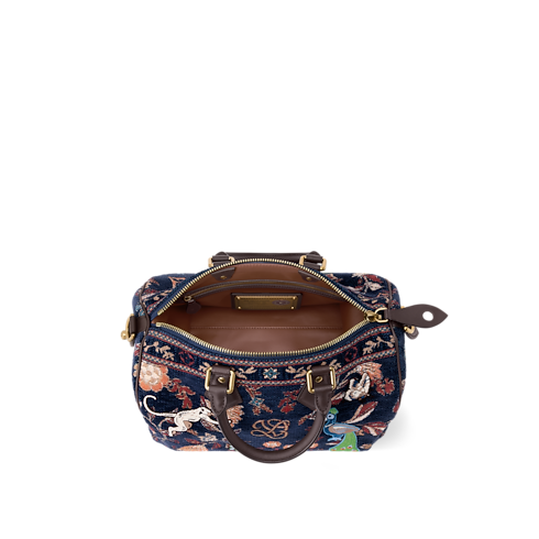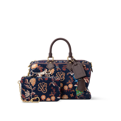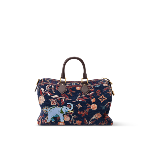 The exceptional Speedy P9 Bandoulière 30 is crafted from jacquard woven with chenille thread into a multicolored warp, creating a tapestry effect. Tufted animals appear embroidered as if moving across the bag. Chocolate-brown leather accents the trim, top handles, and name tag, adding a refined contrast to the vibrant design.