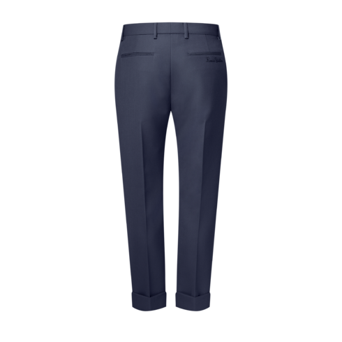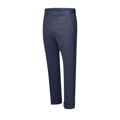 These elegant tailored cigarette pants with cuffed hems are cut from grain de poudre wool in a timeless navy blue. They are signed with an engraved LV medallion on the left belt loop and a tone-on-tone embroidered Louis Vuitton beneath a rear pocket. This versatile piece makes a modern suit paired with a matching jacket.
