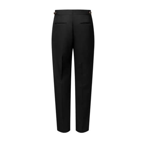 These black tuxedo pants are a timeless wardrobe essential for sophisticated evening events. Tailored from a lustrous wool-silk blend, they have silk panel inserts on the outside of each leg, while rhinestone-embellished Monogram Flower and LV buttons adorn the adjustable waist tabs. A matching jacket and waistcoat make a complete suit.