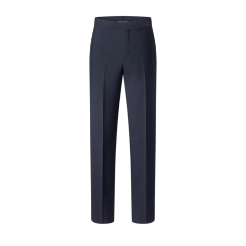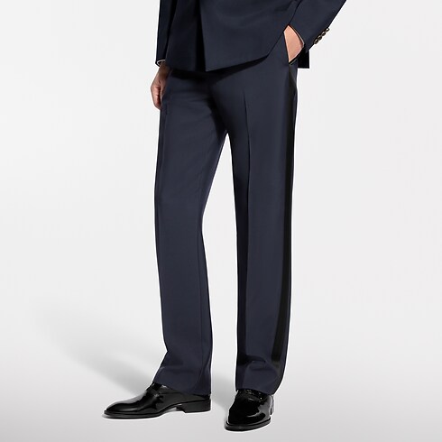 These sharply tailored tuxedo pants have a flattering cigarette fit. They are cut from elegant navy blue grain de poudre wool with black satin bands on the outside of each leg and satin piped rear pockets. A woven LV label discreetly signs the back of the waist. A matching double-breasted jacket makes a poised and timeless evening set.