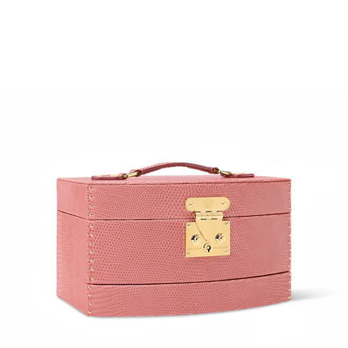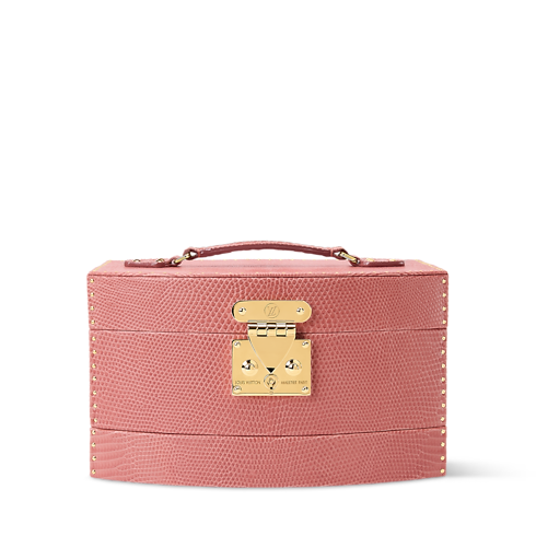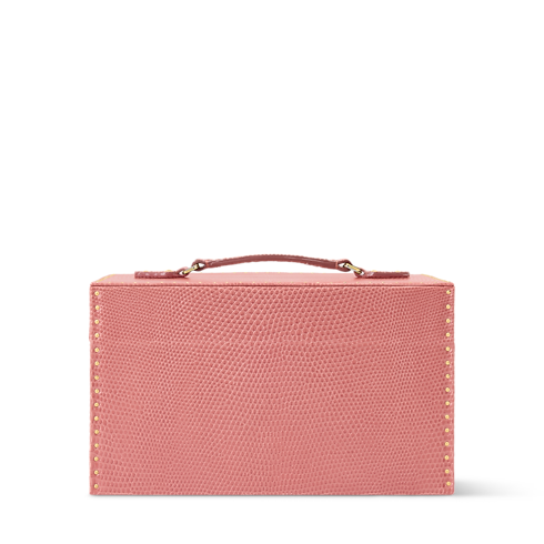 Inspired by the opulent boudoirs of Anne of Austria, the Vanity Cheri, crafted from precious lizard leather with discreet rivets along the sides, comes in a delicate salmon hue with matching lining. The smooth sliding system opens the three drawers simultaneously, giving instant access. Roomy yet light, it’s easy to carry thanks to its compact size and top handle.