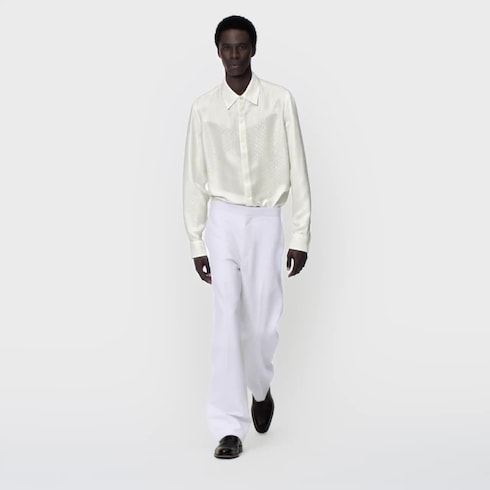 These tailored evening pants stand out from the crowd in a striking white grain de poudre wool blend. Their draped silhouette features subtle inserts in the same fabric on the outside of each leg for a contemporary twist on the tuxedo. With a matching gilet and jacket, this piece is perfect for summery celebratory occasions.