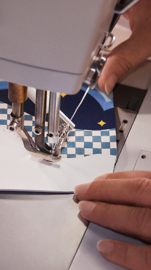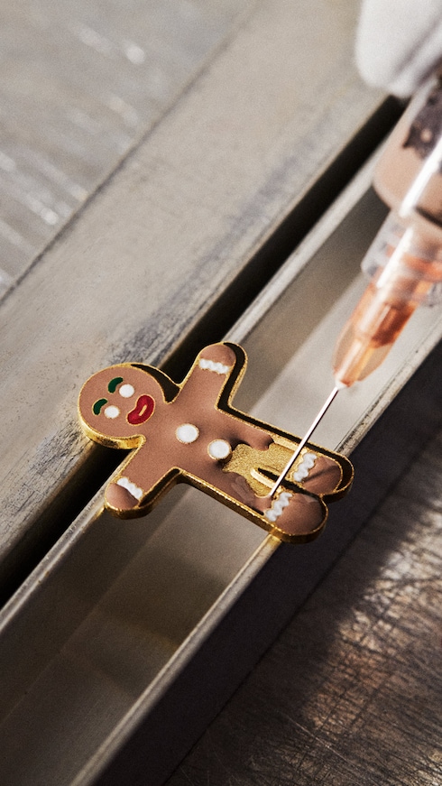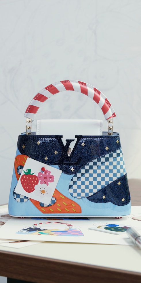 Animated with whimsical embellishments, the Capucines’ smooth surface is layered with a shimmering midnight-blue patent leather in a vibrant patchwork of textures and hues, to transform the iconic bag into a sweet treat – complete with a candy cane handle. “I was extremely impressed by the details that were achieved in this bag: from the mint candy feet made of resin to the enamel gingerbread man who has LV Monogram flower buttons.” - Ziping Wang