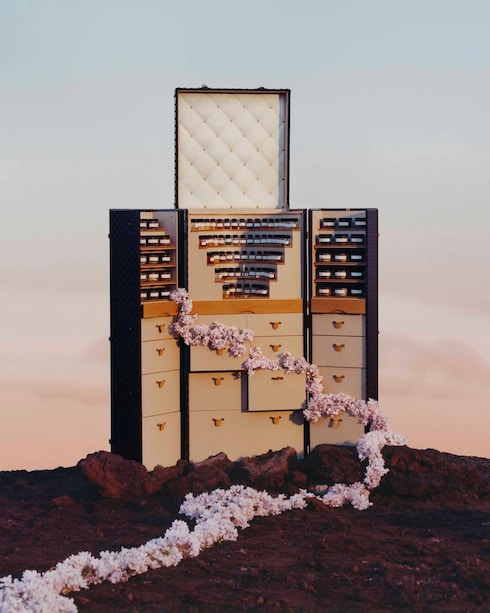 Opening the door to distant horizons, the Perfume Atlas Exclusive Set extends the immersive voyage with a limited edition featuring an exceptional case and 45 vials of the pure essences evoked in the book — composing Louis Vuitton's iconic perfumes.