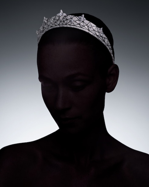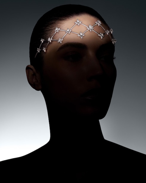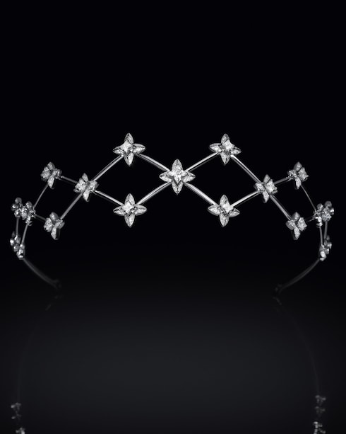 Singularly exploring the pristine white beauty of diamonds, Élégance pays homage to the art of tremblant — multiplying the brilliance of the refined creations. The Maison's signature V unfurls in a graphic interlocking pattern, sprinkled with LV Monogram Star cut diamonds, as a focal point for the Maison's first tiara.