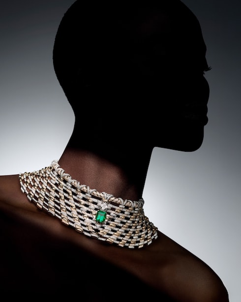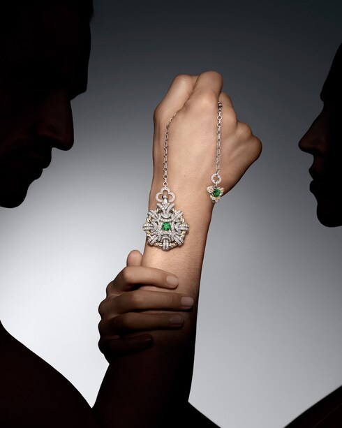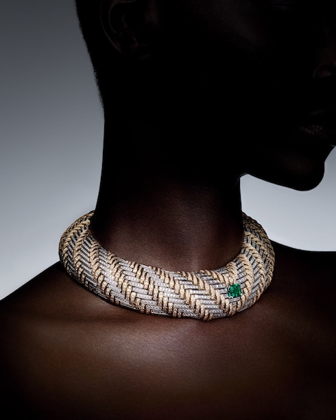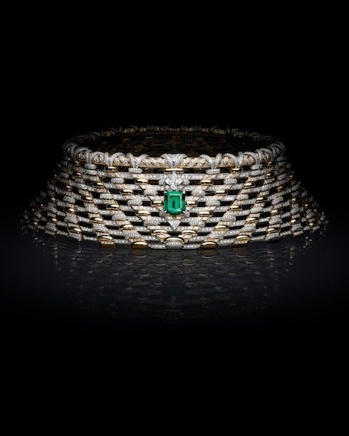 Séduction unveils unprecedented intricacy, celebrating the burgeoning textile and passementerie expertise of the period. Precise details like the V shape, cord-style fringing, and Monogram Kite motif recall the Maison's historic codes, culminating in one of the most impressive necklaces of the collection — featuring an incredible 12.92-carat Zambian emerald, totaling 4,200 hours of work.