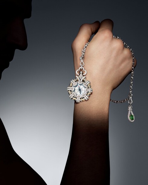 A new Men's capsule revives a storied tradition, celebrating the jeweler's craftsmanship and the House’s unwavering commitment to limitless creativity — symbols of Louis Vuitton's timeless elegance and artistry. Adornments of rare intricacy, a watch, compass, tie clip, and cufflinks are anchored by alluring tsavorites.