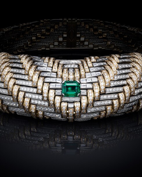 The harmonious beauty of woven fabrics is sublimated in Phénoménal, revisiting the interlacing designs through a bi-color platinum and yellow gold theme. A precious mosaic of diamonds reinforces the signature V in a voluptuous and rounded composition — demonstrating an impressive suppleness.