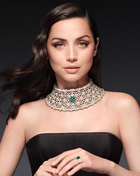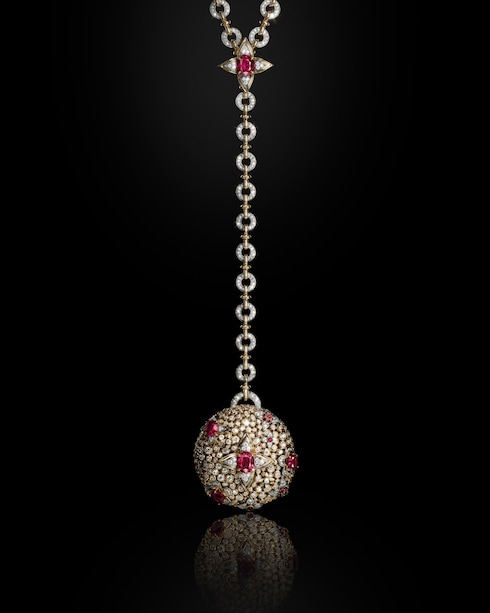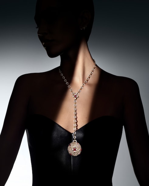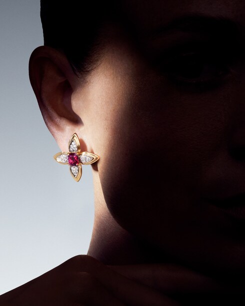 Emulating the contours of ornate imperial interiors, Splendeur masterfully reimagines floral woodwork in an ode to the iconic Monogram Flower. Set with a vivid display of over 110 rubies, the exquisite jewelry pieces boast a charismatic decadence — showcased by a spectacular setting, amongst the largest arrangement ever featured on one creation.