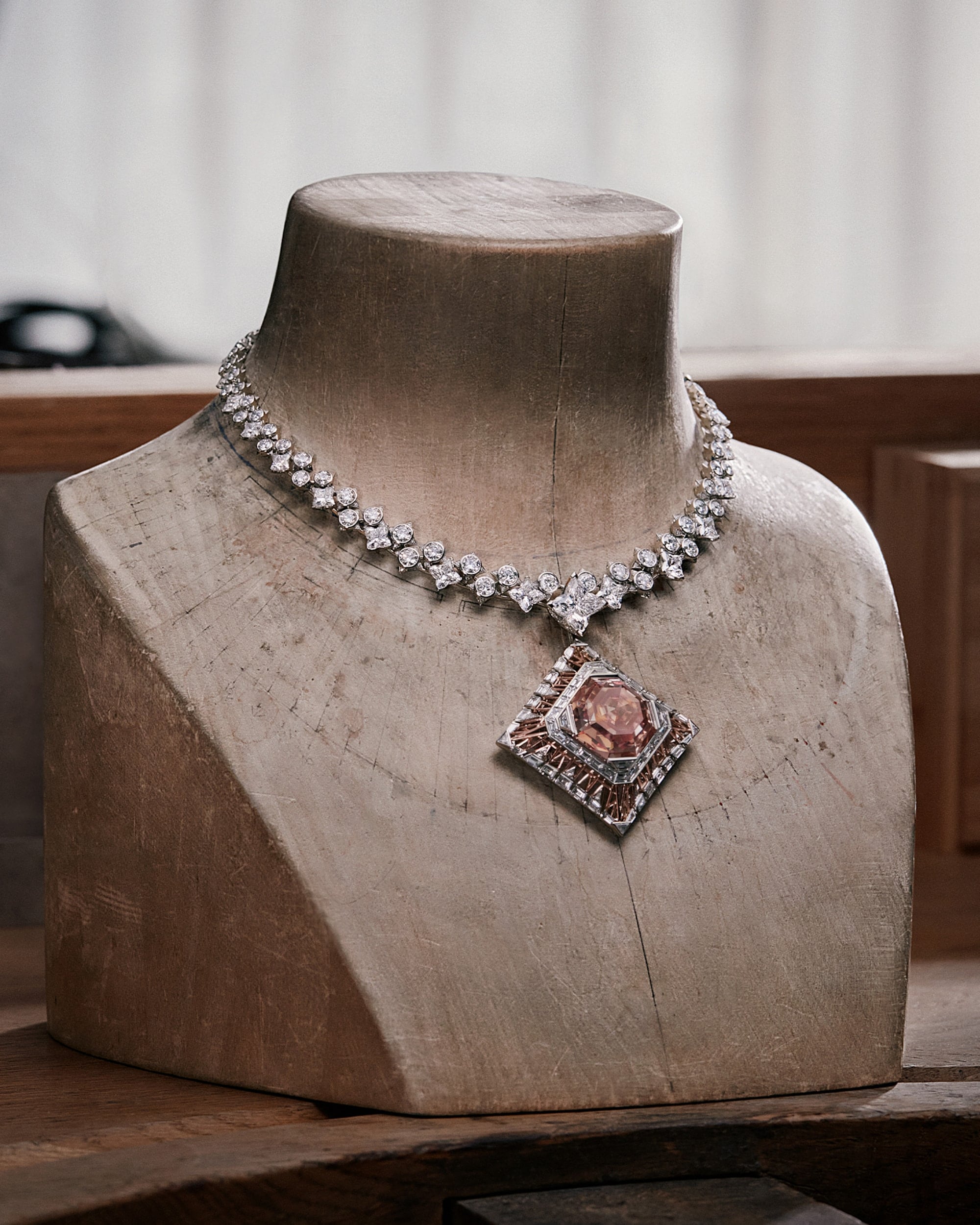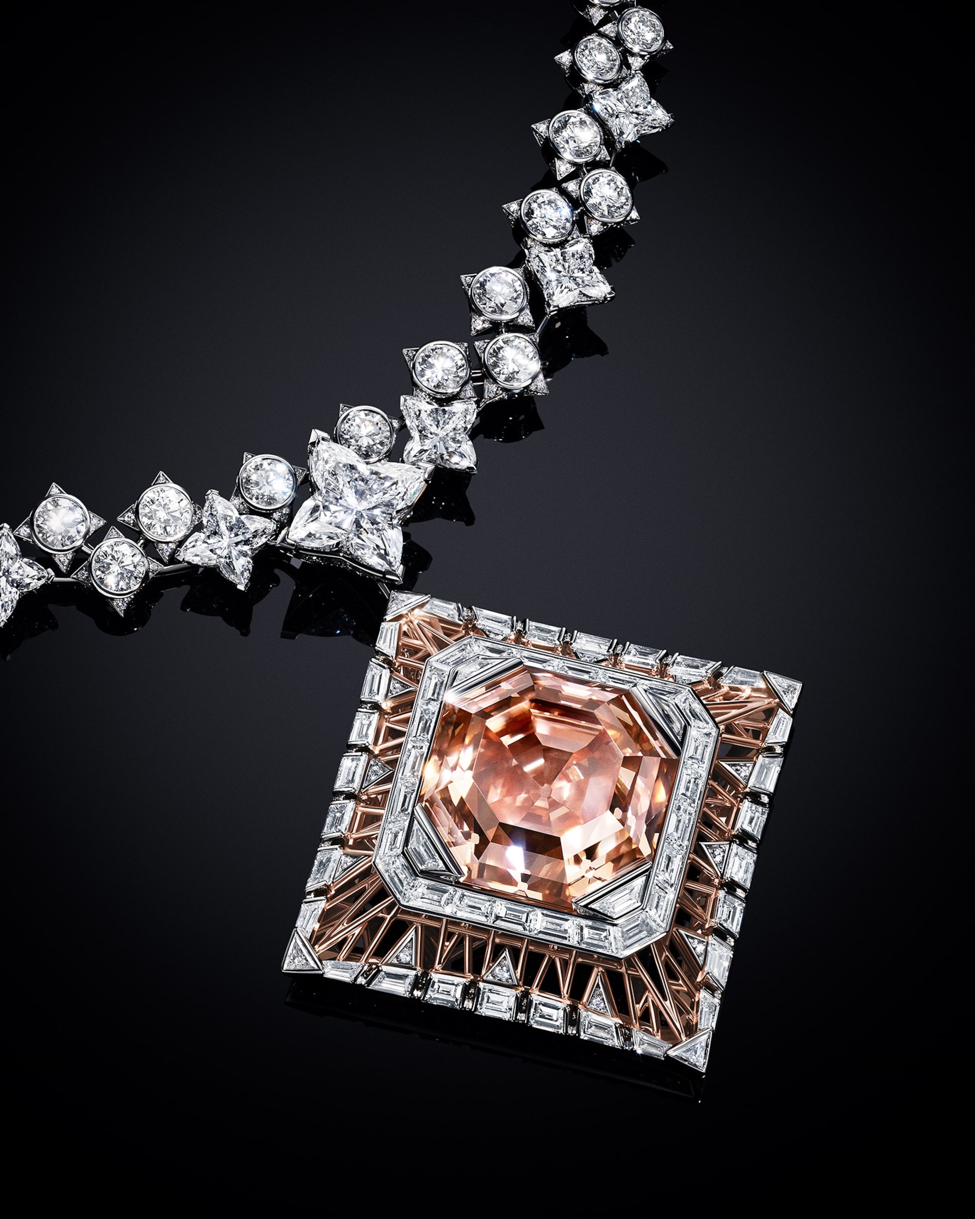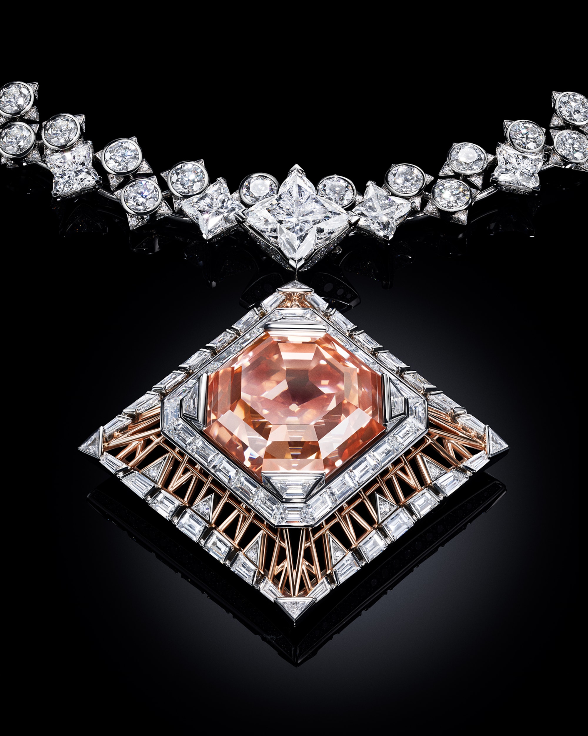 Central to the necklace’s remarkable beauty is an astonishing 56.23-carat diamond, captivating with its unique pink hue infused with hints of orange — a true marvel of nature enhanced by its striking cut and large facets.
