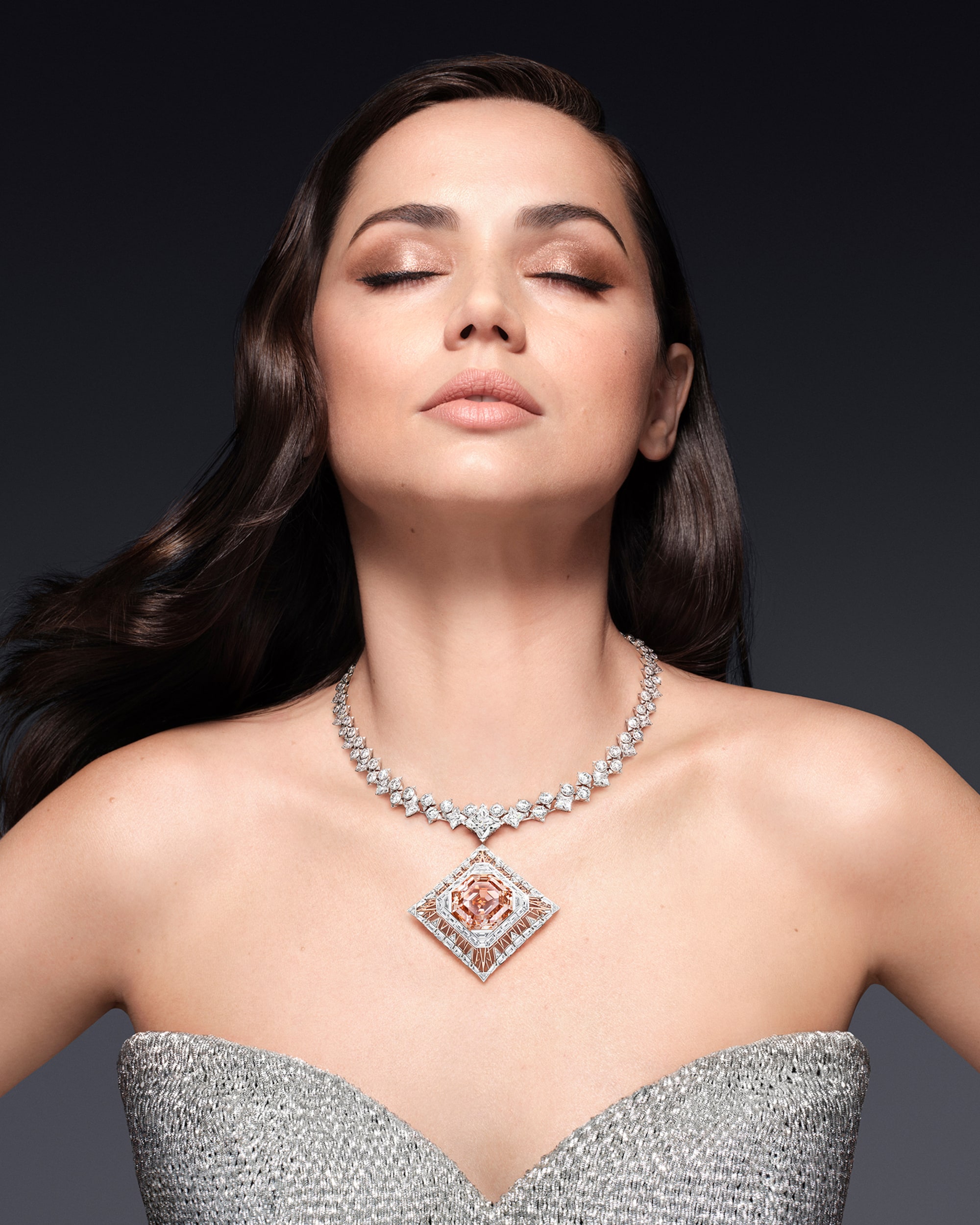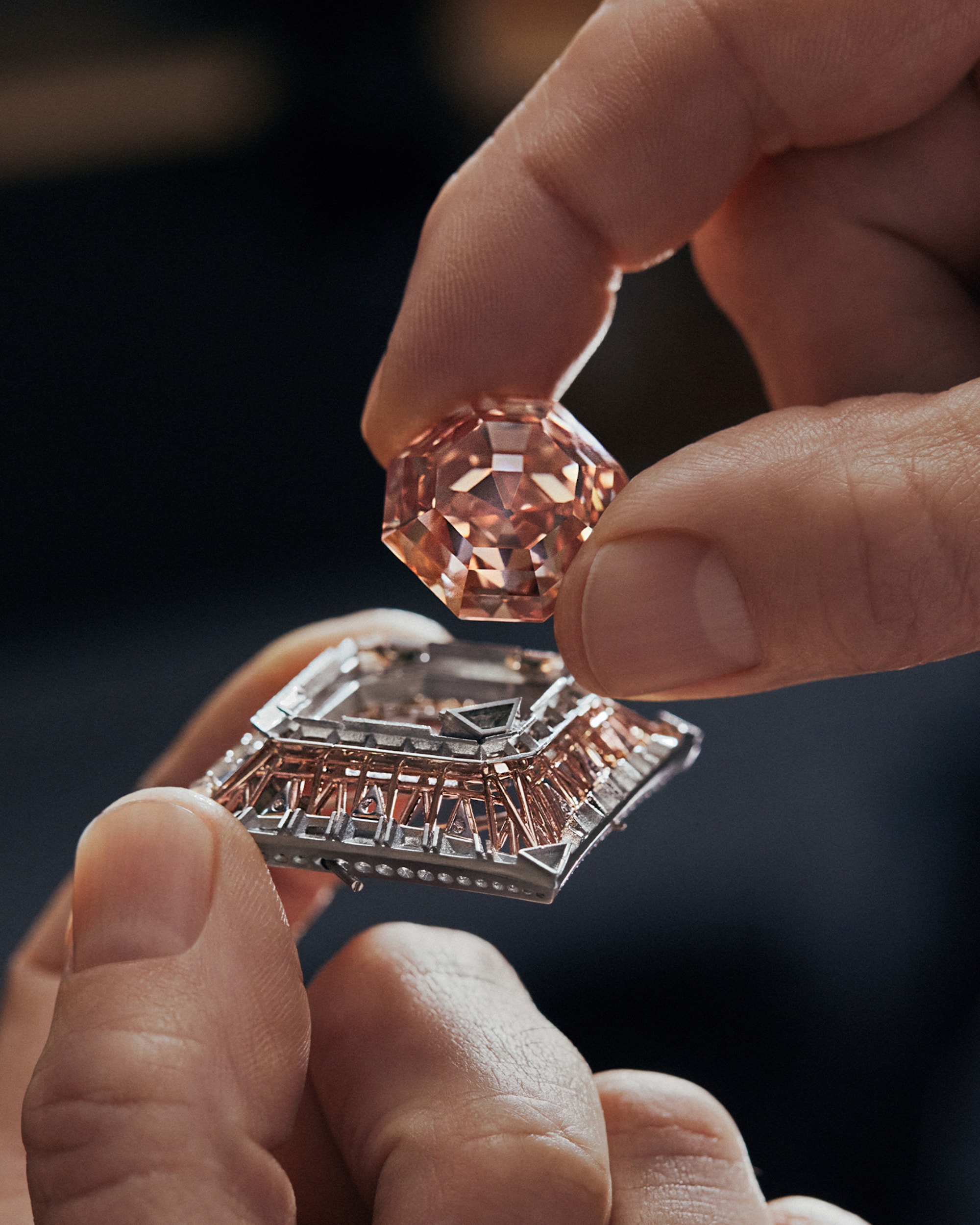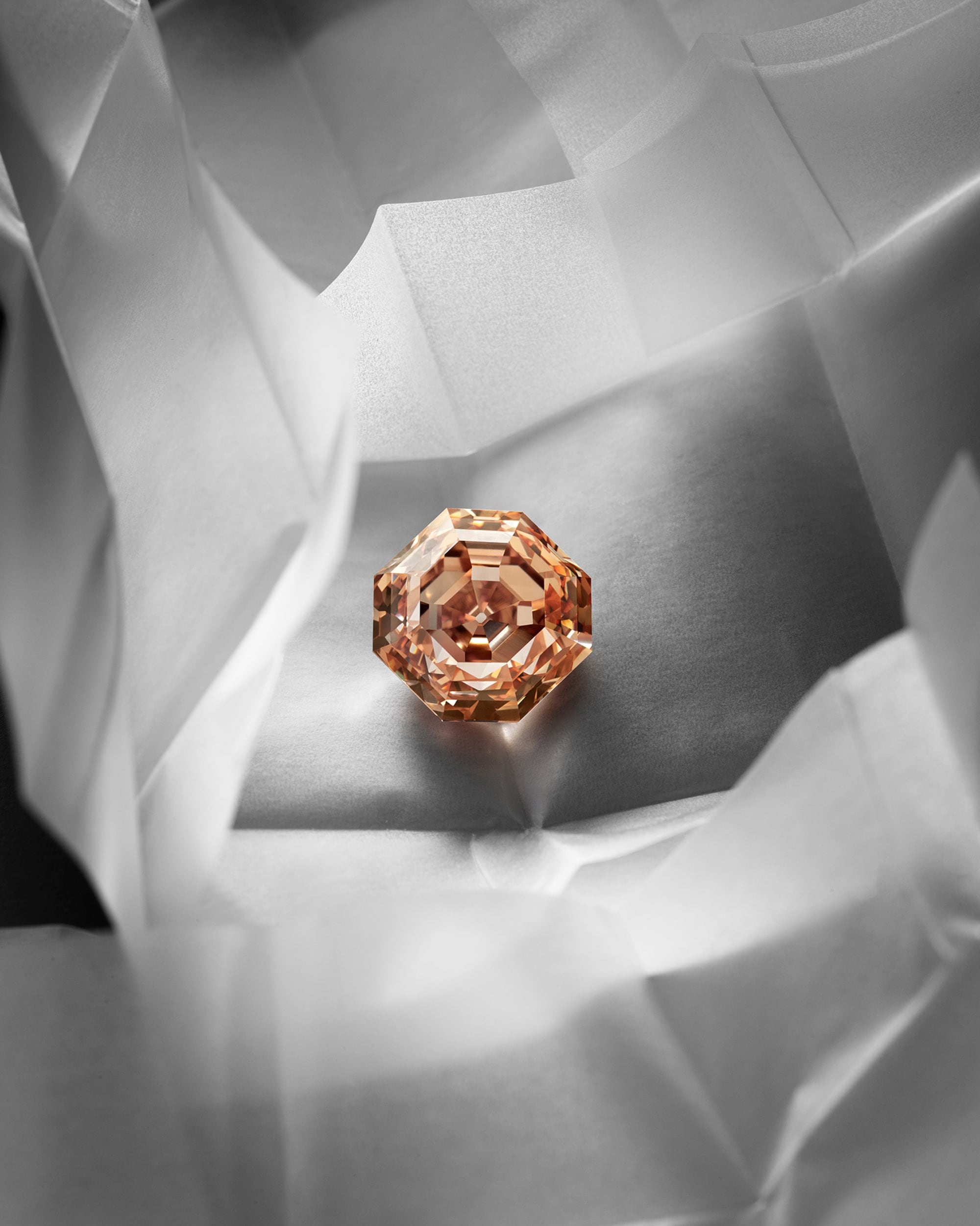 Central to the necklace’s remarkable beauty is an astonishing 56.23-carat diamond, captivating with its unique pink hue infused with hints of orange — a true marvel of nature enhanced by its striking cut and large facets.
