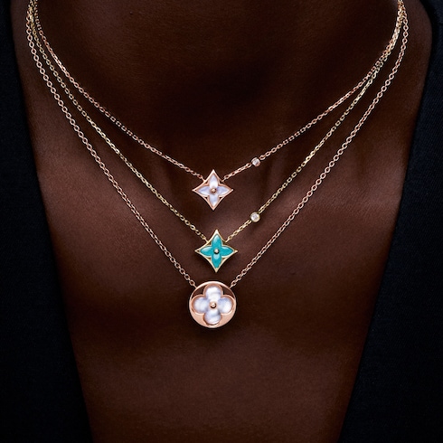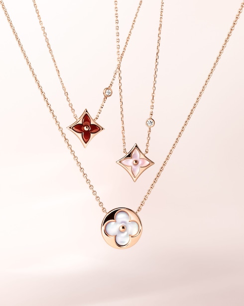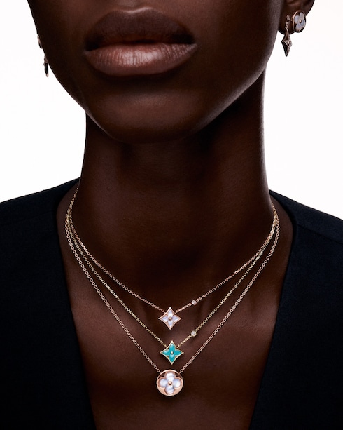 Lively and exuberant, the voluptuous necklaces evoke the subtle femininity of the heritage Monogram Flower in a hypnotic blend of varied stones, settings, and sizes.