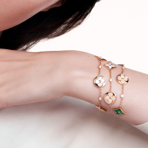Delicate volumes of the timeless Monogram Flower punctuate the hand in a unique arrangement of bracelets, emphasizing a radiant chromatic pairing of unique stones and golds for captivating layering.